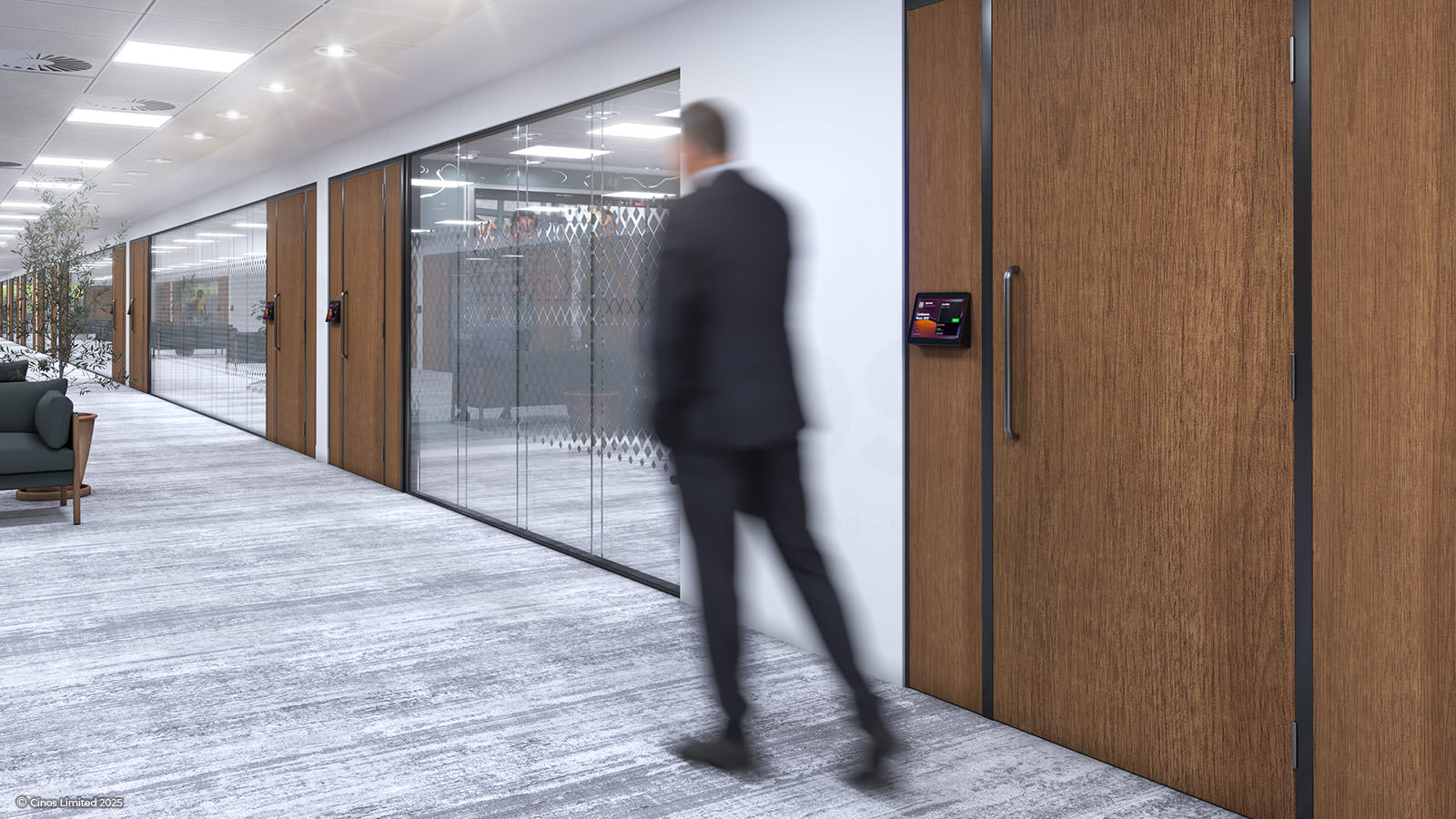 The existing Logitech Rally cameras were reused, while the audio coverage was enhanced with two Shure MXA920 microphone arrays, eight ceiling speakers, and a dual-channel amplifier to provide comprehensive coverage for both individual and combined spaces. Centralised audio management was achieved through a Q-SYS processor, which routed audio to the appropriate Teams room system based on the configuration of the room. A ceiling-mounted partition sensor was installed to detect the position of the room divider and automatically adjust the audio setup.