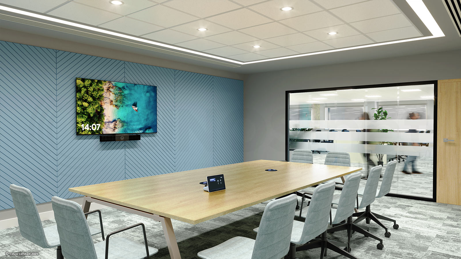 The equipment in each meeting space was selected to optimise the user experience for both in-room participants and those joining remotely. In the smaller huddle rooms for two – three participants, Cinos installed 43” Samsung displays alongside Poly Microsoft Teams Room systems consisting of Studio P15 video bars, Teams PCs, paired with the GC8 touch panels for system control. In the medium meeting rooms, Cinos installed 65” – 75” Samsung displays, complete with Poly Studio premium USB video bars, Teams PCs and Poly GC8 touch panels.
