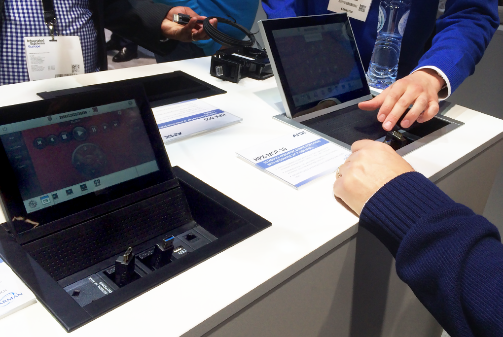 The latest developments in touch panel technology were also on display at the AMX stand. The most recent innovations aim to reduce table clutter in the form of the Modero X Retractable and HydraPort Touch Panels. Whilst not in use, the touch panels can either retract into the table or close with the HydraPort; completely hiding the control system interface to provide an aesthetically pleasing environment.